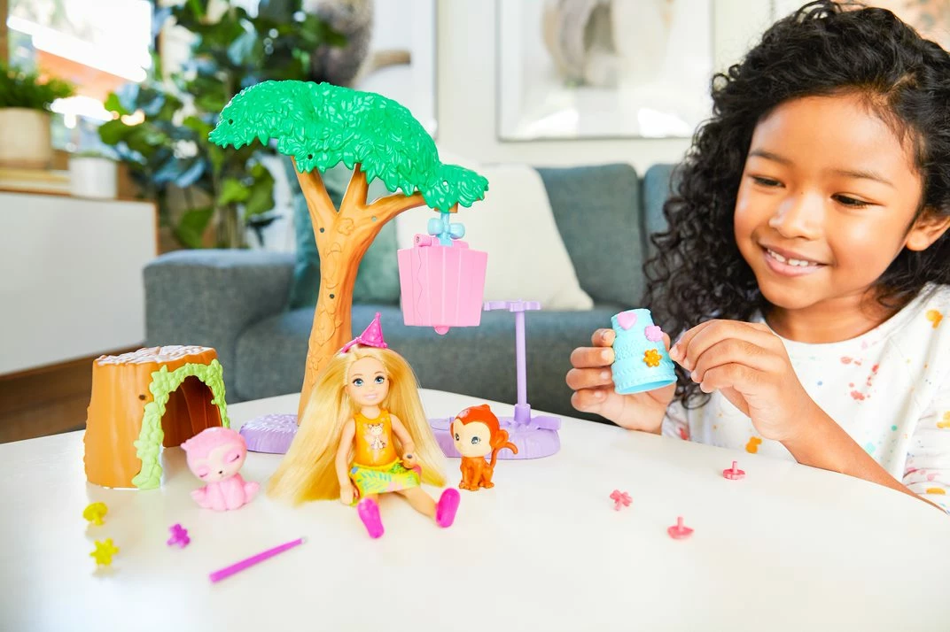 Dolls and playsets inspired by Barbie® and Chelsea™ The Lost Birthday™ take young imaginations on adventures packed with exploration and animal friends! Chelsea™ doll is celebrating her birthday with her baby animal pals and a big present packed with fun surprises. Kids can clip Chelsea™ doll and her monkey friend into the playset, then spin them to help Chelsea™ doll swing at the surprise reveal gift. When it breaks open, a rainbow of plug-and-play accessories will pour out! Use them to decorate the tree and Chelsea™ doll’s cake, then celebrate with her baby sloth and monkey friends — her animal pals can plug into the playset for lots of active play and inspired storytelling! Doll cannot stand alone. Colors and decorations may vary.?