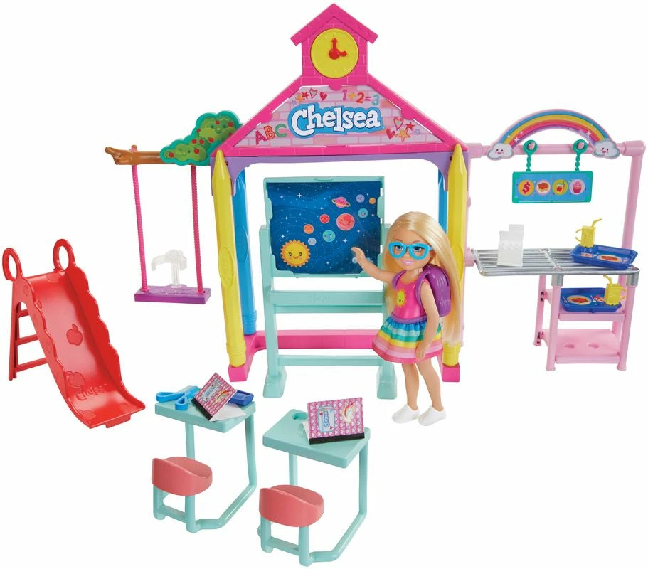 Chelsea and her friends inspire young minds to explore the world. Just like big sister Barbie, they love to try new things, challenge themselves and have fun. This Barbie Club Chelsea School playset is the perfect place for young minds to explore the classroom and beyond! Sweet schoolhouse decorations, storytelling accessories and multiple play areas inspire imaginative fun. When class is in session, seat Chelsea doll and a friend (sold separately) in the two desk and chair sets. A blackboard accessory encourages storytelling: flip it back and forth to switch between subjects. When it’s time for recess, send Chelsea doll down the slide or clip her into the swing and push! Don’t forget to stop by the cafeteria for a snack — a lunch counter, trays and a cash register add to the storytelling fun. Young imaginations will love exploring the school setting and playing out their own sweet stories because when a girl plays with Barbie and her sisters, she imagines everything she can become! Collect all the Chelsea dolls and toys to expand the playtime possibilities (each sold separately, subject to availability). Colours and decorations may vary. Features: Barbie Club Chelsea dolls and toys inspire imaginations to explore the world with fun themes kids love – like this Chelsea school playset with multiple play areas and pieces that can be arranged and rearranged for storytelling fun! A classroom area inspires storytelling with desk and chair sets for Chelsea and a friend (sold separately) and a flipping blackboard with fun graphics. A cafeteria space features a lunch counter with a cash register and lunch trays, so Chelsea doll can grab a snack before recess. When it’s time to play, send her down the slide or clip her into the swing and push! With so many themed play pieces, like notebooks, juice boxes, school supplies, a backpack and pair of glasses for Chelsea, imaginations can play out endless school stories. Chelseaâ„¢ doll is ready for class in a top with a sun graphic, a removeable skirt with bright rainbow print and casual white shoes. With so many storytelling pieces and multiple play areas, this Chelsea doll and school playset makes a great gift for kids 3 to 7 years old. Collect all of the Chelsea dolls and accessories for even more storytelling fun (each sold separately, subject to availability). Barbie Club Chelsea Doll and School Playset, 6-inch Blonde, with Accessories Includes Chelseaâ„¢ doll wearing skirt and shoes, school playset, 1 pair of glasses, 1 pair of scissors, 1 glue bottle, 1 cash register, 2 juice box accessories, 2 notebooks, 2 lunch trays, 1 slide, 2 desks, 1 blackboard accessory and 1 backpack. Other doll is not included. 3+