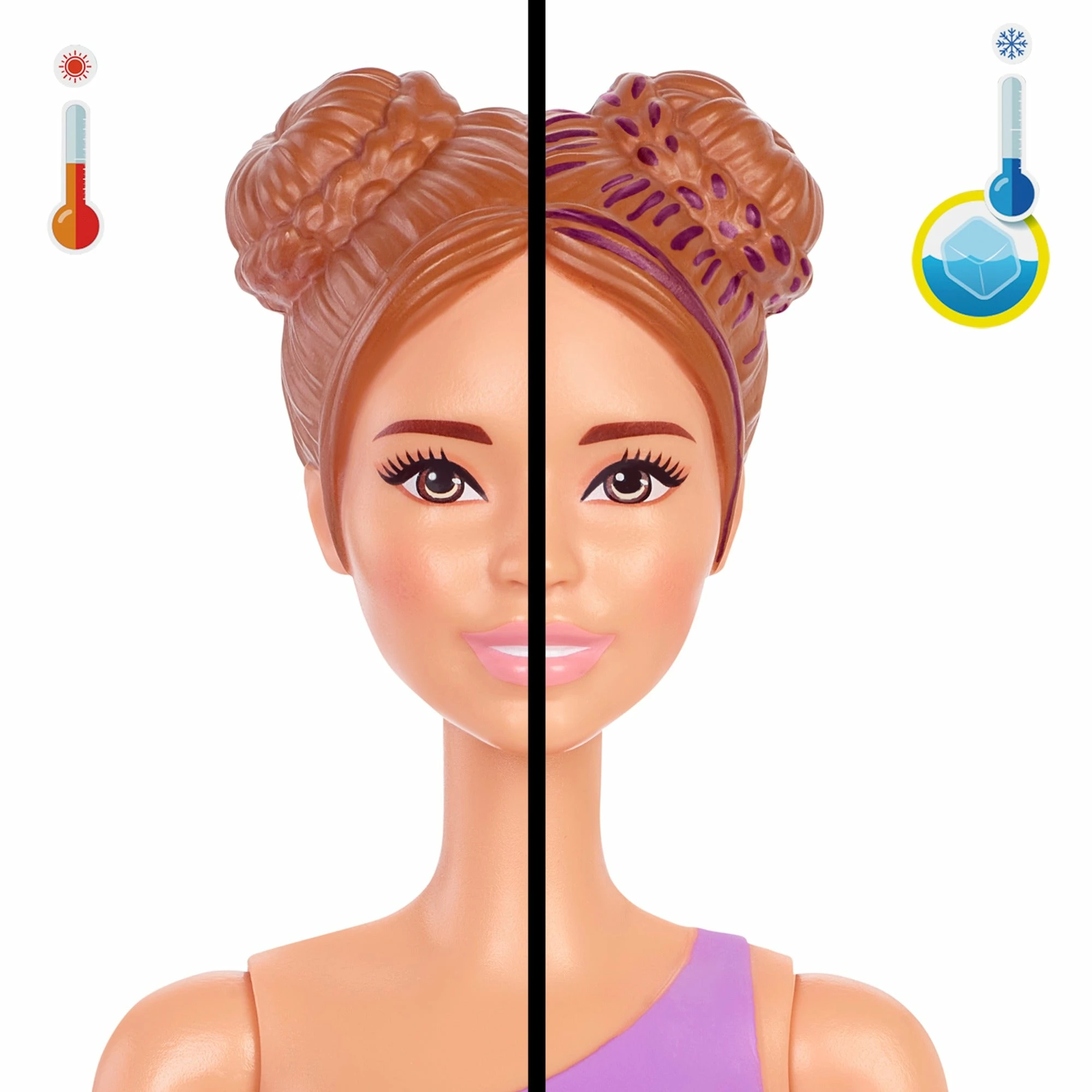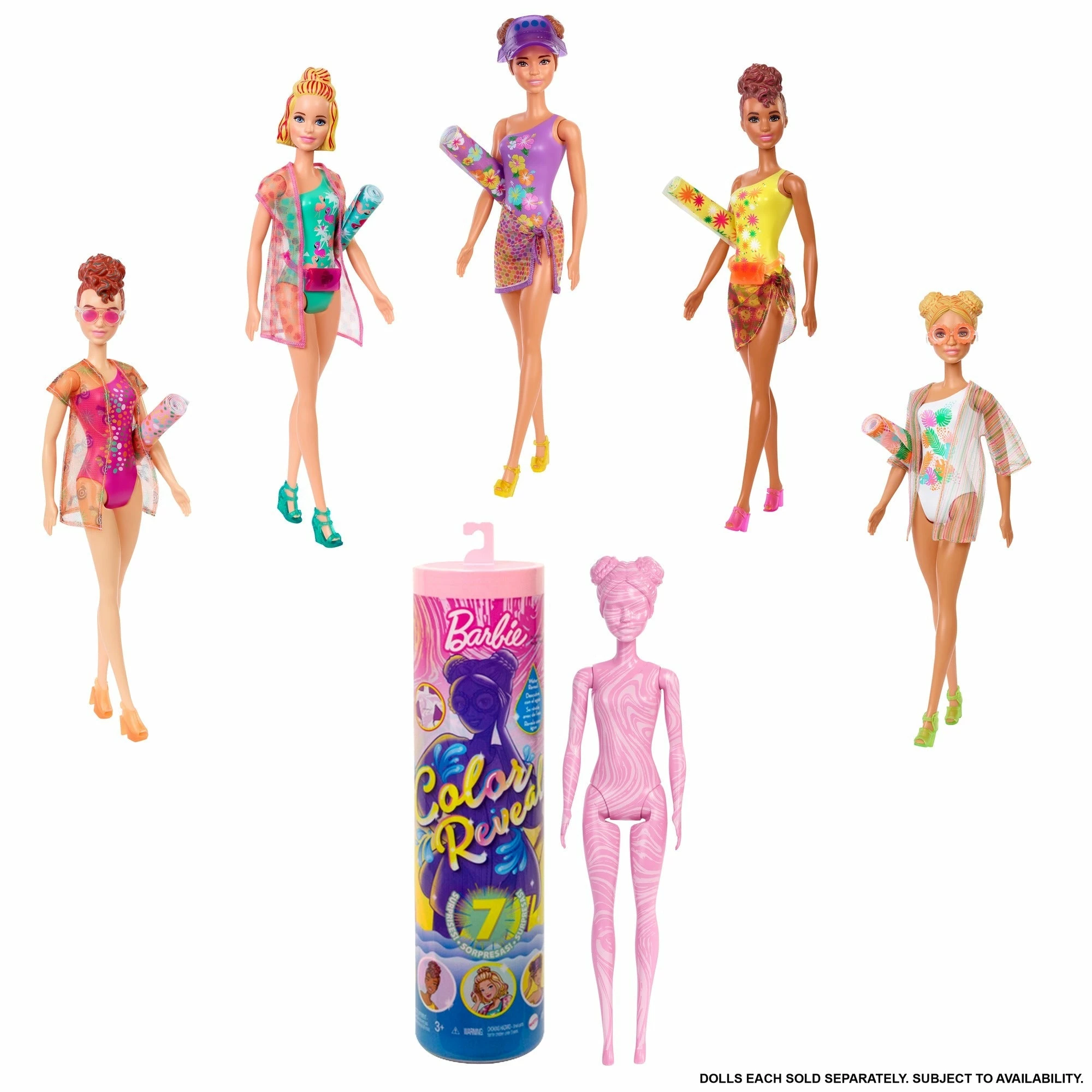 Barbie Color Reveal dolls deliver an unboxing experience full of surprises — seven of them! A doll wearing a colorful patterned swimsuit is guaranteed, but each doll’s look remains a mystery until revealed. The packaging is part of the fun — pull the strip to remove the outer layer and reveal a clear tube. Inside is a mystery pink marble Color Revealâ„¢ doll and four bags hiding surprises inside. Remove them all and fill the tube with warm water, then insert the doll and swirl her around. The water turns pastel pink, and when the doll is pulled out, her features are revealed! Each doll has a different combination of eye color, molded hair, skin tone and decorated swimsuit, but the surprises continue…open the bags to discover a cover-up, pair of shoes, accessory and towel! Color-change effects on the dolls’ hair and an accessory add to the surprise and fun. Each series has a unique theme — these Color Reveal dolls are all about sand and sun. Use the tube to store these and other favorites. Which doll will you reveal? Kids can collect them to mix and match accessories and expand the possibilities!