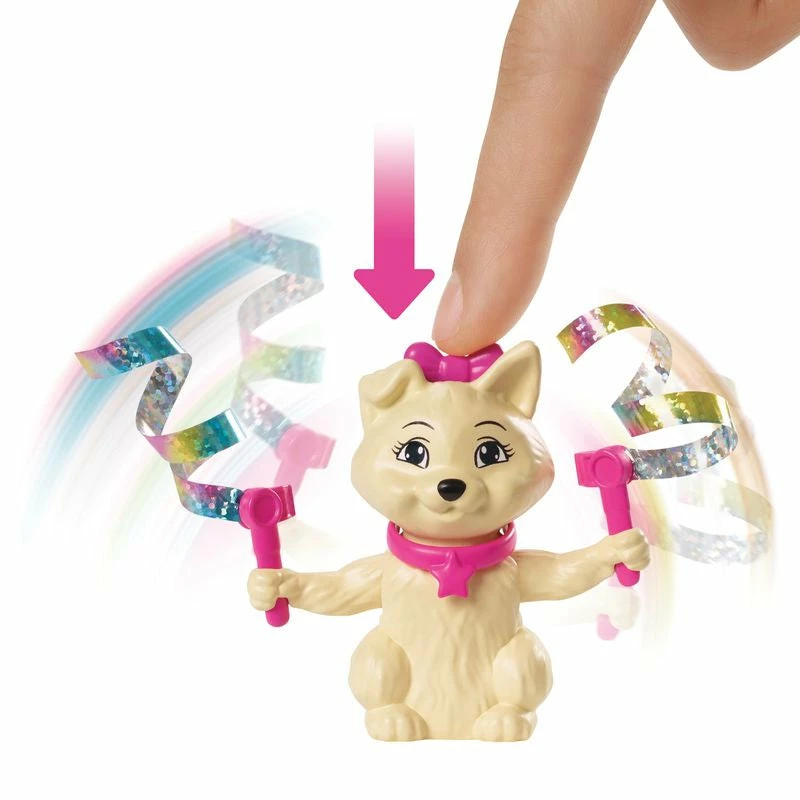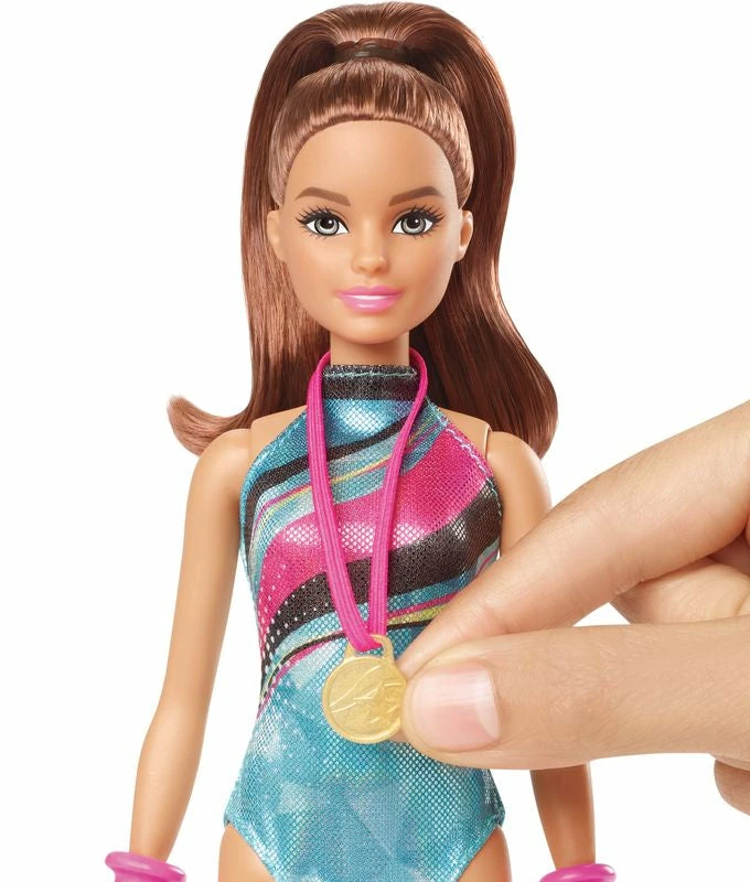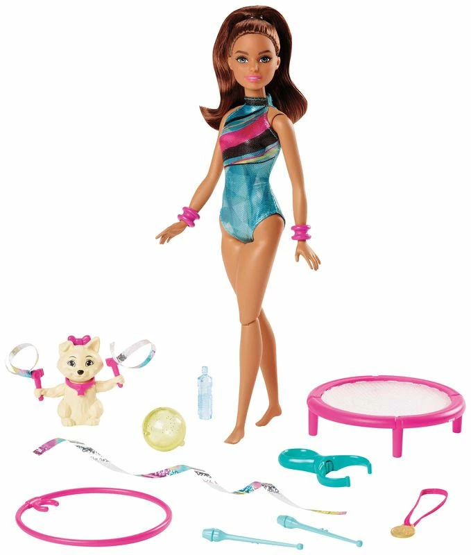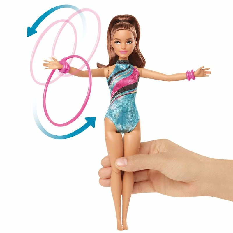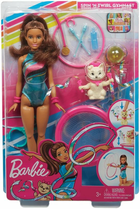 Spark storytelling and sports-play with Barbie dolls inspired by Barbie Dreamhouse Adventures! Young imaginations can play out spin n’ twirl action with Teresa doll and her gymnastics-themed Barbie set. Fasten the blue ring to her waist and twirl it to help her cartwheel or flip. Then clip the hoop to her wrist and watch her spin it! Teresa doll’s puppy friend loves to join in the fun — press down on her head to watch her wave her ribbons or place her on the trampoline and help her bounce. Teresa Spin ‘n Twirl gymnast doll bends at the knees and comes with accessories fit for the ultimate floor routine, like clubs, a ribbon, water bottle and ball. When she’s scored a perfect ten, storytellers can reward her with a gold medal accessory. With dolls inspired by Barbie Dreamhouse Adventures, imaginations can peek into the everyday lives of Barbie, her sisters and their friends as they embark on exciting adventures together. Aspiring athletes will love taking this gymnast doll on active adventures and exploring sports stories because when a girl plays with Barbie and her friends, she imagines everything she can become! Collect all the Barbieâ„¢ Dreamhouse Adventures dolls and toys to recreate favorite moments or dream up adventures of your own. Each sold separately, subject to availability. Doll cannot stand alone. Colors and decorations may vary. Features: Storytellers will flip for Teresa Spin ‘n Twirl gymnast doll, inspired by Barbie Dreamhouse Adventures, in a shimmery leotard with colourful stripes. Help Teresa nail her gymnastics routine — fasten the blue exercise ring to her waist to help her flip and cartwheel or clip the hoop to her wrist to watch her spin it. Place Teresa doll’s puppy friend on the trampoline and help her bounce or press her head to watch her wave her ribbons! Gymnastics-themed accessories like a trampoline, ribbon, ball, clubs, water bottle and a gold medal inspire imaginative fun. When a girl plays out sports stories with Barbie and her friends, she imagines everything she can become! Collect all the Barbie Dreamhouse Adventures dolls and toys to recreate favourite moments or dream up adventures of your own. Each sold separately, subject to availability. Barbie Dreamhouse Adventures Teresa Spin ‘n Twirl Gymnast Doll, 11.5-inch Brunette, in Leotard, with Accessories Includes 1 Barbie Teresa doll, 1 puppy figure, 1 trampoline, 1 ribbon, 1 ball, 1 gold medal accessory, 2 clubs, 1 water bottle, 1 hoop and 1 exercise ring. 3+
