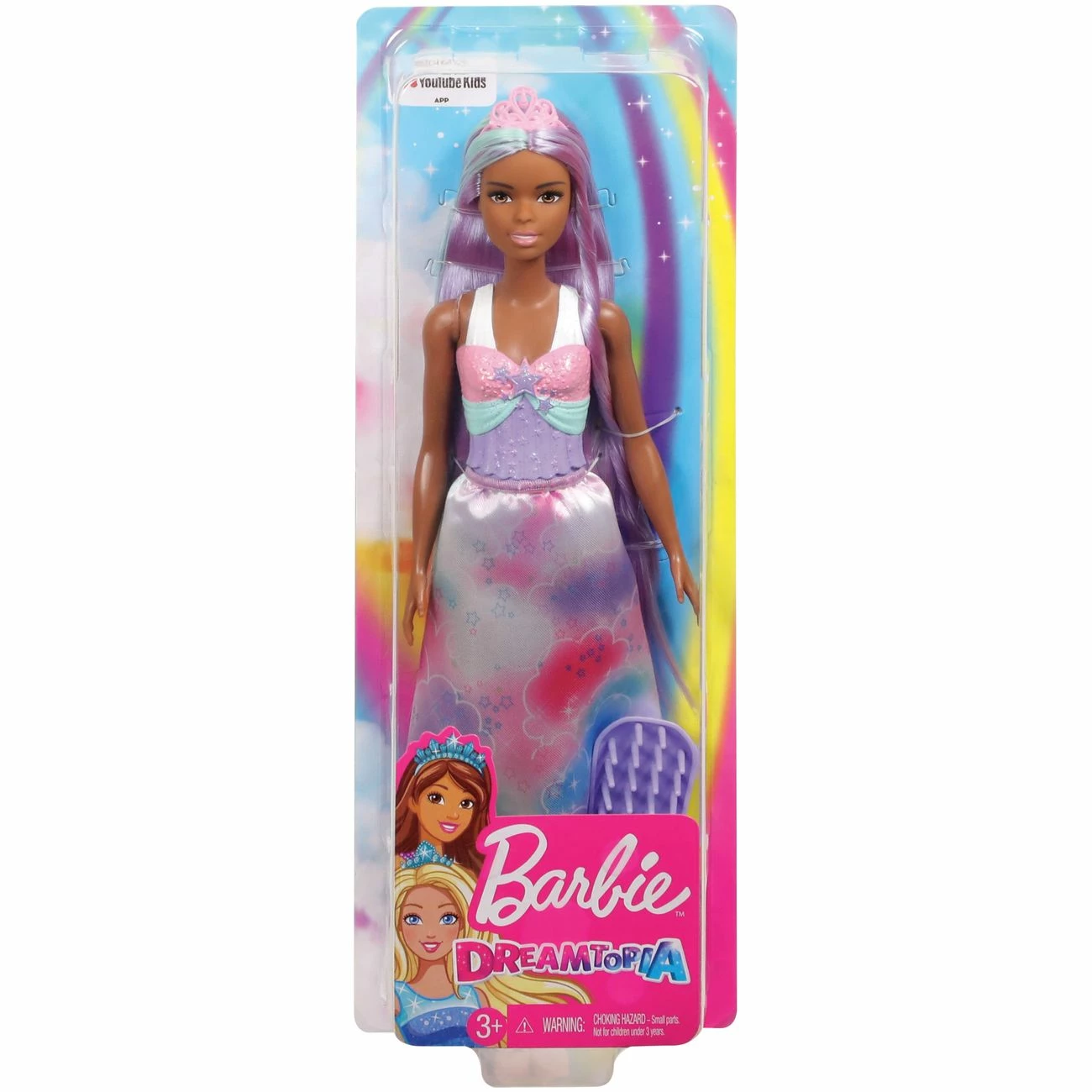 With fantasy-colored hair, these Barbie™ Dreamtopia princess dolls inspire young stylists to dream up all kinds of ‘dos! Each doll has extra-long hair in bright shades — brush their silky locks with the included hairbrush and top with the tiara for a royal occasion. Each doll wears a decorated bodice and shimmery colorful skirt with a dreamy print that can be removed for dress-up play. Matching shoes complete each princess look. Take these princess Barbie® dolls to a ball or on an adventure. It’s easy to play out dreams real and imagined because when you enter Dreamtopia with sisters Barbie® and Chelsea™, you wake up to a world where dreams become reality! Collect all the Barbie™ Dreamtopia dolls and toys and let your dreams set sail. Includes Barbie™ Dreamtopia doll wearing fashion and accessories, plus brush. Each sold separately, subject to availability. Dolls cannot stand alone. Colors and decorations may vary.