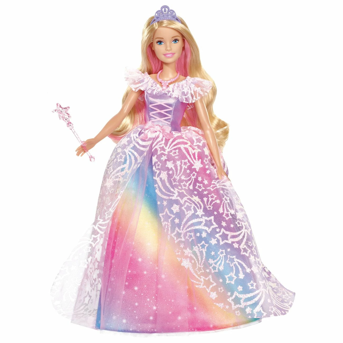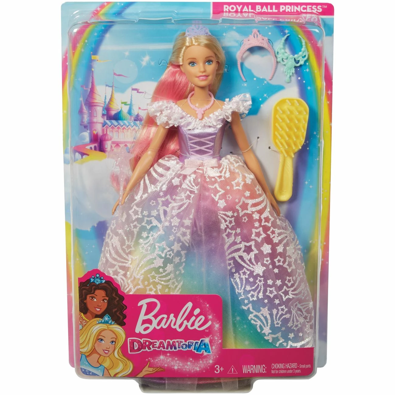 Barbie™ Dreamtopia Royal Ball Princess doll takes imaginations to magical places! Barbie® doll wears a gorgeous fairytale look, has bright pink hairstreaks and comes with five fantastical accessories for even more fantasy flair. The beautiful ball gown gets oohs and ahhs with lace-up detail, ruffled shoulders and a full skirt with layers of rainbow fabric, sparkling tulle and a sheer overlay with glittery star print. Help Barbie® princess doll add just the right accessories for her next royal occasion. She comes with two tiaras, two necklaces and a star-tipped wand! Brush out her pink-streaked hair with the included hairbrush and arrive at the royal ball in style. Young imaginations will love playing out favorite scenes and fairytale dreams because when you enter Dreamtopia with sisters Barbie® and Chelsea™, you wake up to a world where dreams become reality! Collect all the Barbie™ Dreamtopia dolls and toys and let your dreams set sail (each sold separately, subject to availability). Includes Barbie™ Dreamtopia Royal Ball Princess doll wearing fashion and shoes, plus two tiaras, two necklaces, one wand and a brush. Doll cannot stand alone. Colors and decorations may vary.