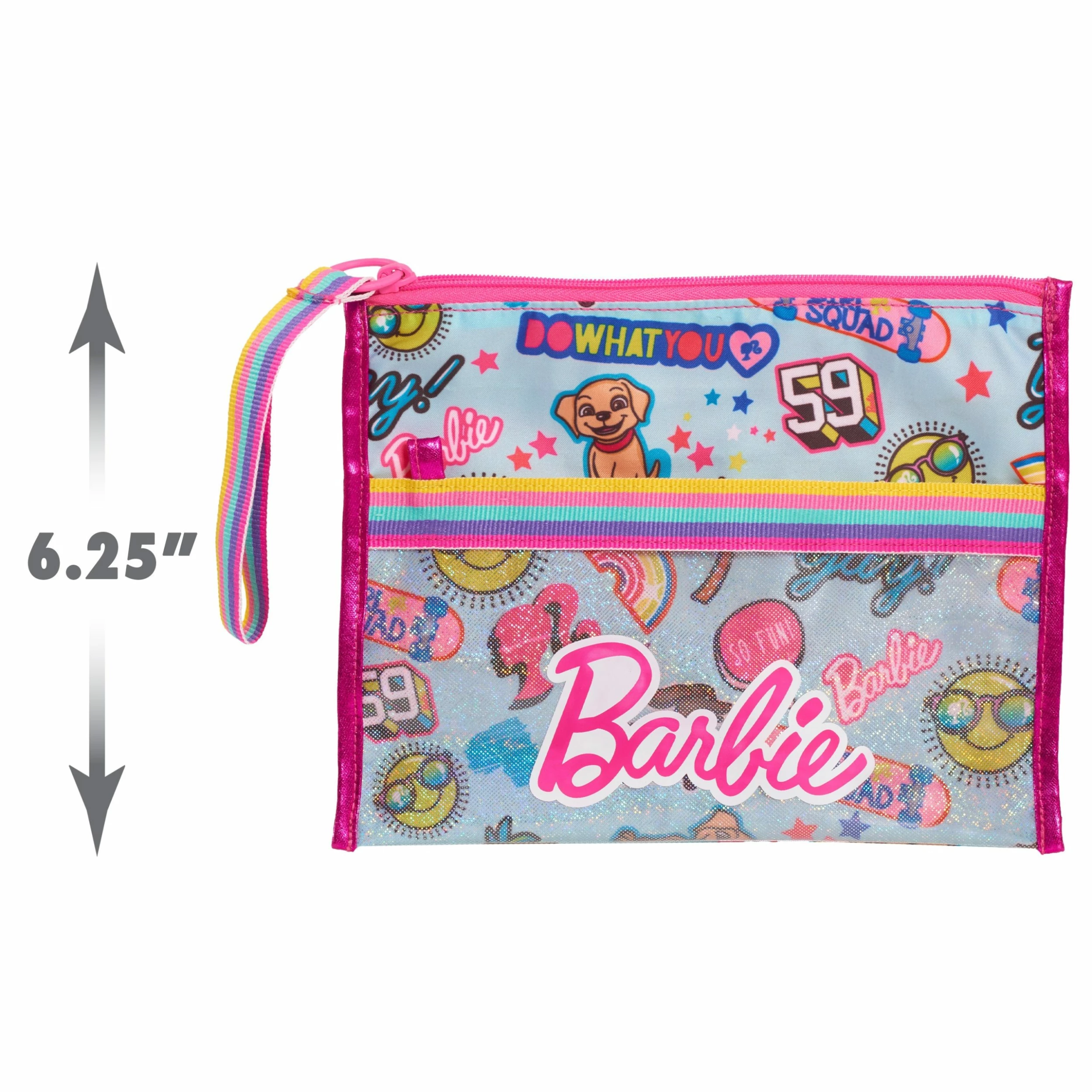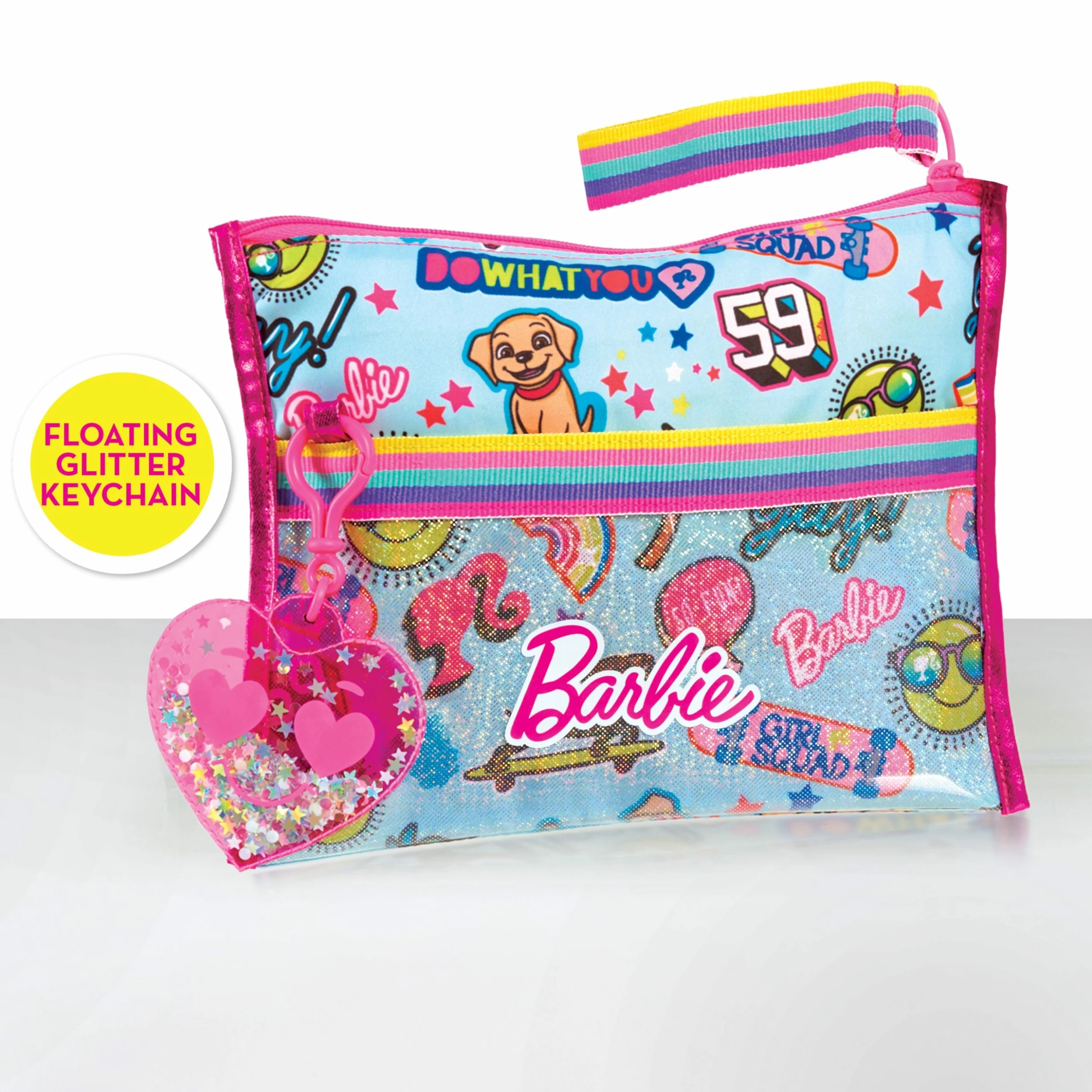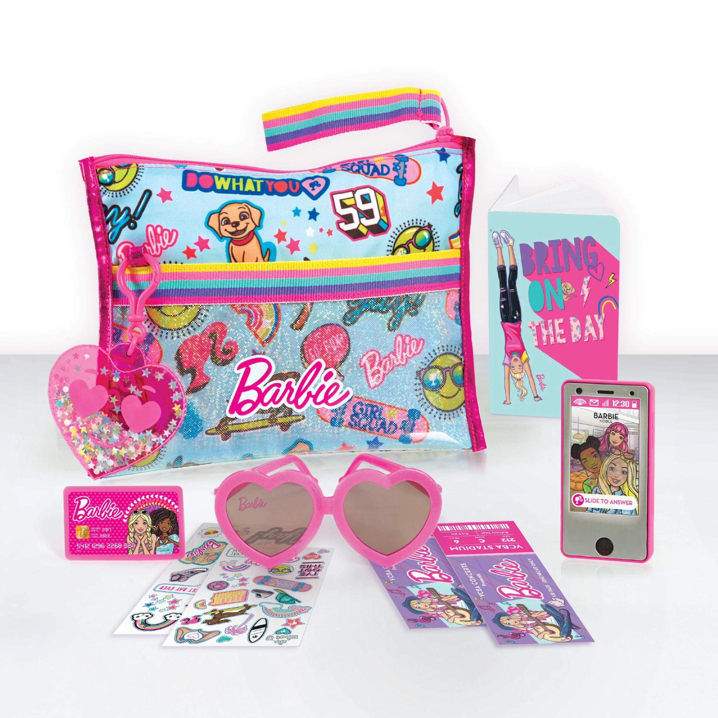 Be a Barbie fashionista with the Barbie Electronic 10-Piece Purse Set! This trendy purse set features floating glitter and holographic vinyl. The fashionable accessories are perfect for pretend play! Kids can call their friend Barbie on the cellphone that rings and lights up. As they plan their next shopping trip, they can get ready in style with the mirror and heart shaped sunglasses. This fab set also includes a notebook and stickers empowering kids to bring on the day. Set includes a purse, cellphone, credit card, sunglasses, notebook and stickers, and a trapped glitter keychain charm. Ages 3+
