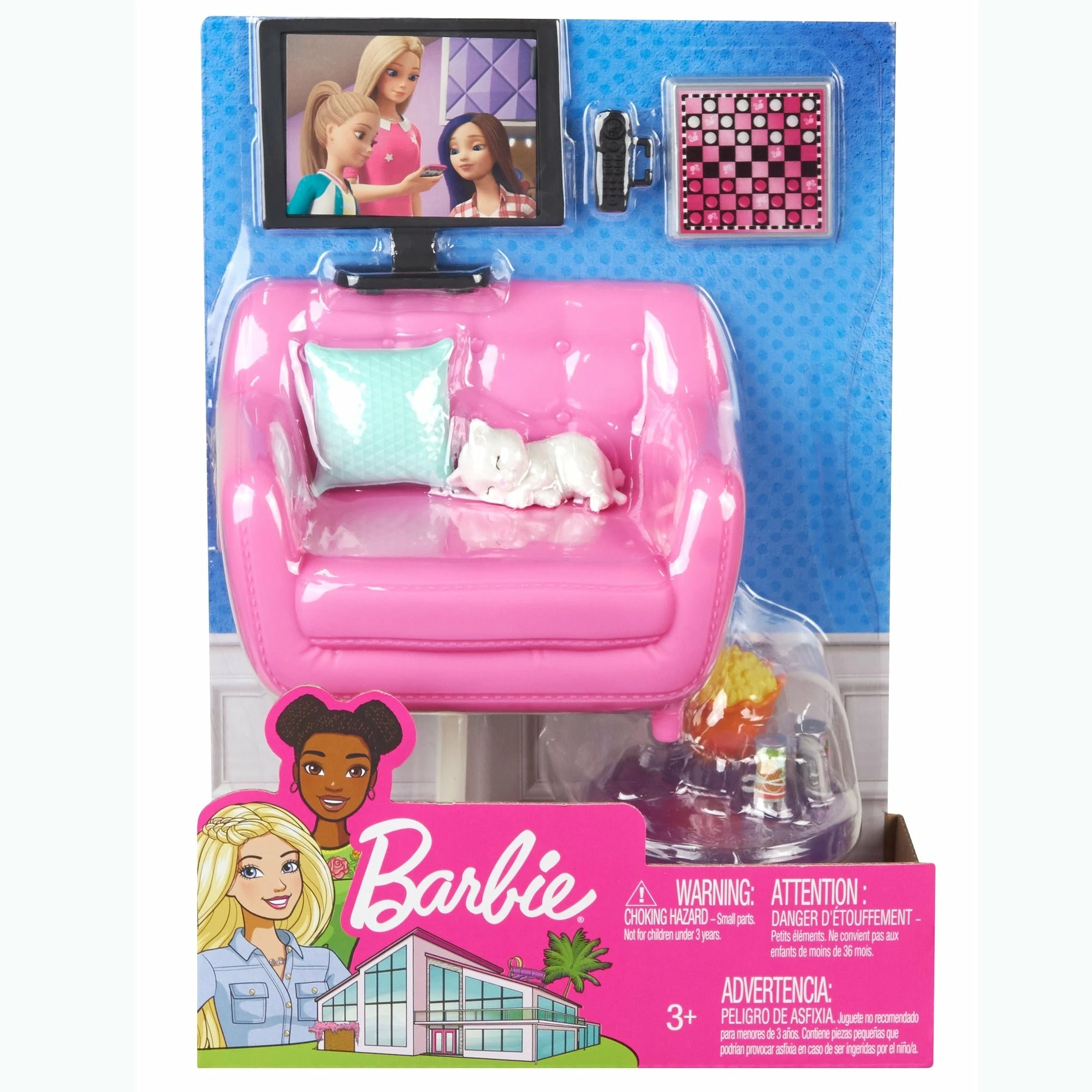 The living room set has a kitten; furniture like a big pink couch, table and tv stand; and accessories like a bowl of popcorn, game board and more.