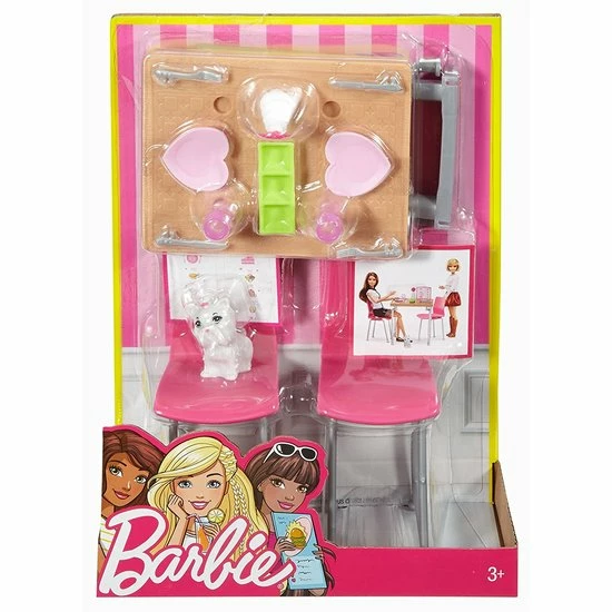 Enjoy a night indoors with the Barbie collection of indoor furniture plus pet packs, like this dining set with puppy. The furniture packs make it easy to spend a night in with fabulous furnishings, themed accessories and a pet friend for bonding. Arrange and rearrange the pieces to tell fun stories. The trendy furniture has signature style and the realistic accessories open up the play possibilities. Barbie doll (sold separately) and her puppy friend can taste delicious food at this dining set. The “wooden” table and two pink chairs have silvery legs for a modern touch, and the accessories include breakfast, dinner and dessert. Two heart-shapedplates, two pink glasses, a green serving tray and two utensil sets dress up any meal. A vase with flower is a sweet touch. And a menu means you can order in or take out. The adorable white puppy is ready to share a meal or grab a dropped bite. Add variety to Barbie doll’s play spaces by collecting all of her fabulous furnishings and accessories (each sold separately, subject to availability).