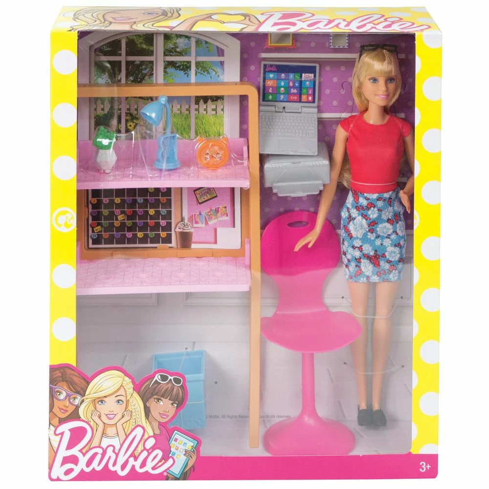 ?Explore “at-home” play with the Barbie© collection of room furniture and Barbie© doll sets. They help every room tell a special story with signature style. Arrange and rearrange the pieces to create new scenes and storytelling possibilities. Barbie© doll is ready to work in this office space. The desk fits today’s trends with a “wooden” frame, pink shelves and a backdrop with calendar and bulletin board decals. The pink chair is sleek. And the recycling basket is a modern touch. Play out a workday or study session with the laptop, printer, clock, lamp and plant. Barbie© doll is smartly styled in a red top and floral print skirt. Black shoes and black eyeglasses complete the look. Explore your work style with this office space designed to spark imaginations because with Barbie©, you can be anything! Add variety to Barbie© doll’s rooms by collecting all of her fabulous furnishings and accessories (each sold separately, subject to availability). Includes Barbie© doll wearing fashions and accessories, desk, chair and themed accessories. Doll cannot stand alone. Colors and decorations may vary.