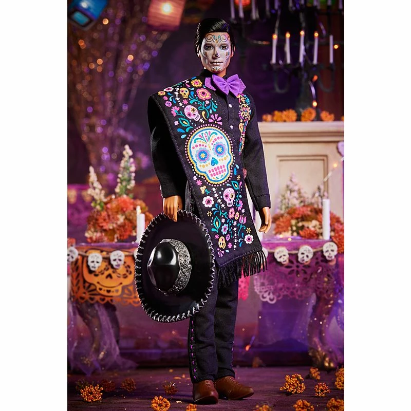 Dia De Muertos 2021 Ken® doll wears a charro-inspired look featuring a serape and embroidered shirt complemented by a vibrant bowtie. A silvery sculpted sugar skull design decorates his sombrero and belt buckle, and his face is painted in a striking calavera design. Brown boots and a matching belt complete his look. In beautiful packaging featuring an original illustration, this collectible doll is ideal for display and gifting.