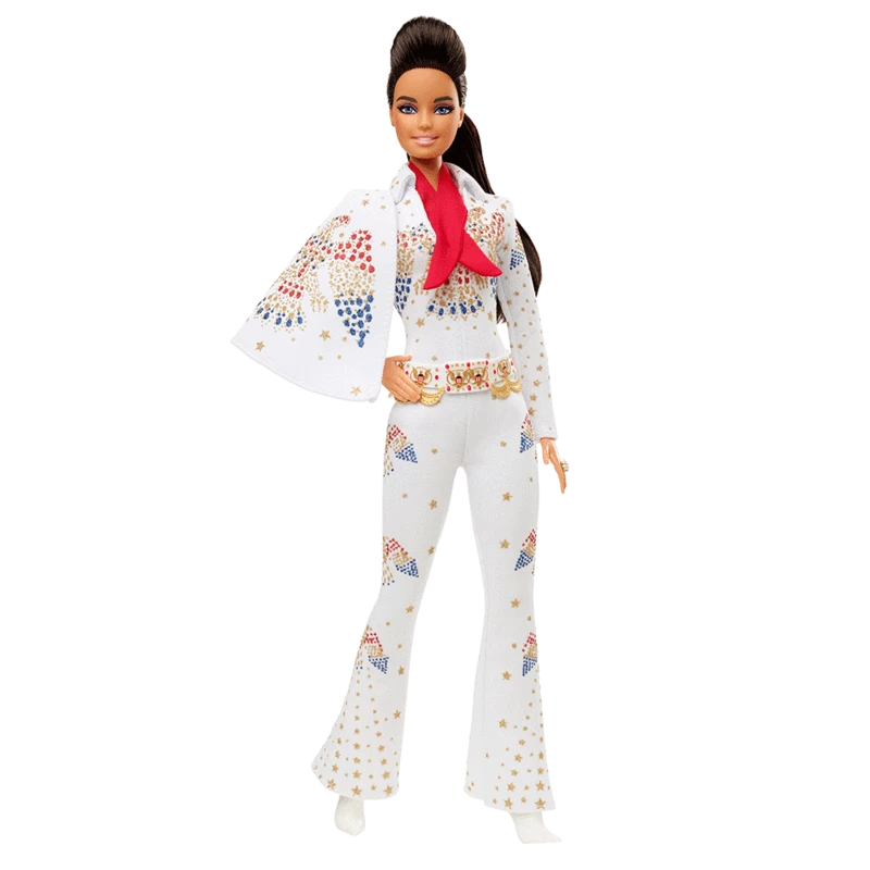 Like the original he wore during concerts, the outfit is emblazoned with red, gold and blue sparkling eagles, has an attached cape, red scarf, belt and bell-bottoms. With a doll stand, Certificate of Authenticity and packaging that’s ideal for display, Elvis Presley Barbie® doll makes a great gift for fans and collectors.