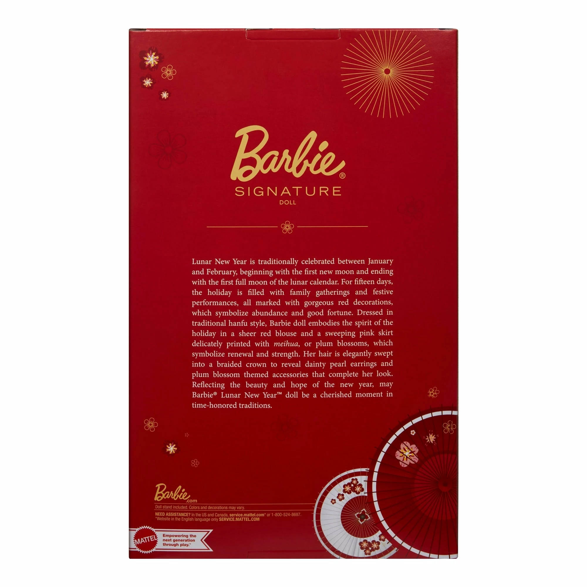 Her hair is swept into a braided crown revealing dainty, pearl-like earrings and plum blossom-themed accessories. Reflecting the beauty and hope of the new year, may Barbie® Lunar New Year doll be a cherished addition to time-honored holiday traditions.