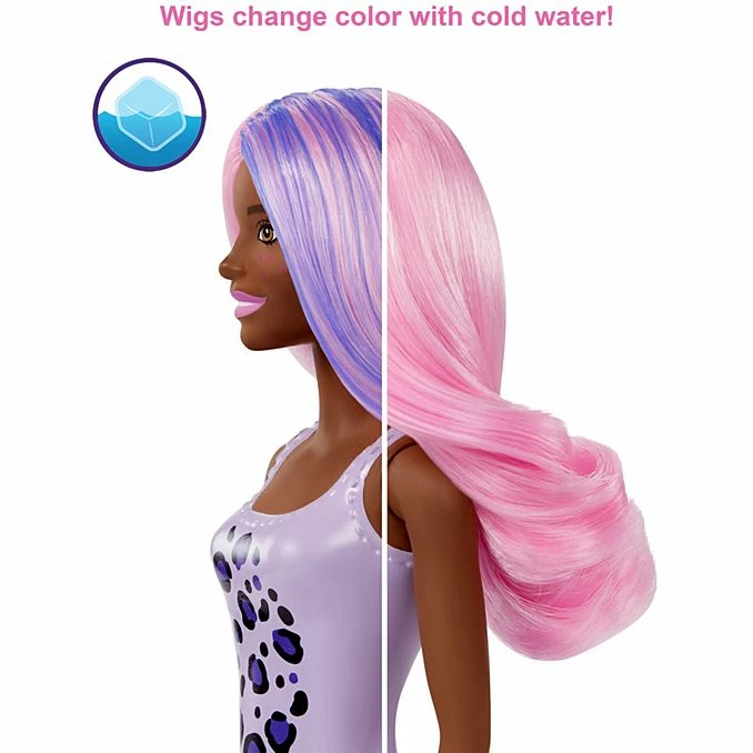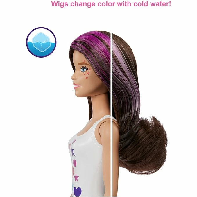 - ?For even more transformation, dip the sponge in ice cold water and use on the color-change pieces — 2 long-haired wigs, 2 pets, 2 accessories and Barbie® doll’s hair and face — for a new look.