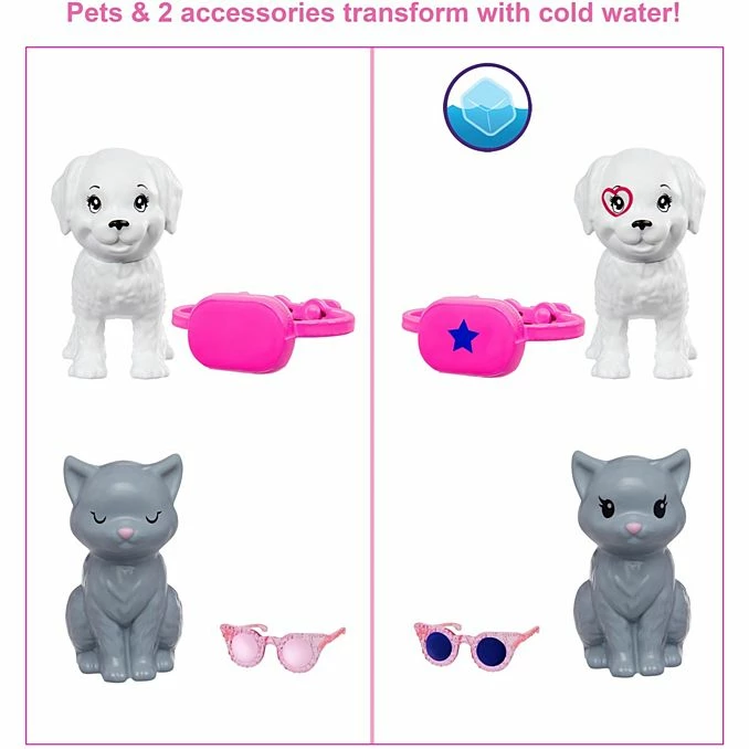 Dip the sponge in ice cold water and use it to transform the color-change pieces — like two of the accessories and two pets. With the use of warm and ice cold water, kids can repeat the moment over and over again! With so many surprises and so many pieces, kids will have so many stories to tell. Which doll will you reveal? Kids can collect them to mix and match accessories and expand the possibilities! Includes doll, two pets, two outfits, two bags, two color-change wigs, two color-change accessories, sponge and additional themed pieces.