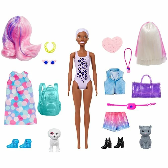 - ?The Barbie® Color Reveal dolls deliver the ultimate delight with 25 surprises and lots of transformation — kids unbox this multi-piece set to find a Color Reveal Barbie® doll, 2 Color Reveal pets, 2 complete looks and 8 color-change features that include 2 long-haired wigs!