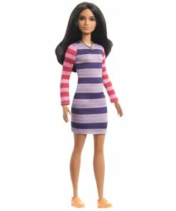 BARBIE FASHIONISTA DOLL #147 BRUNETTE HAIR WITH PURPLE AND PINK STRIPED DRESS