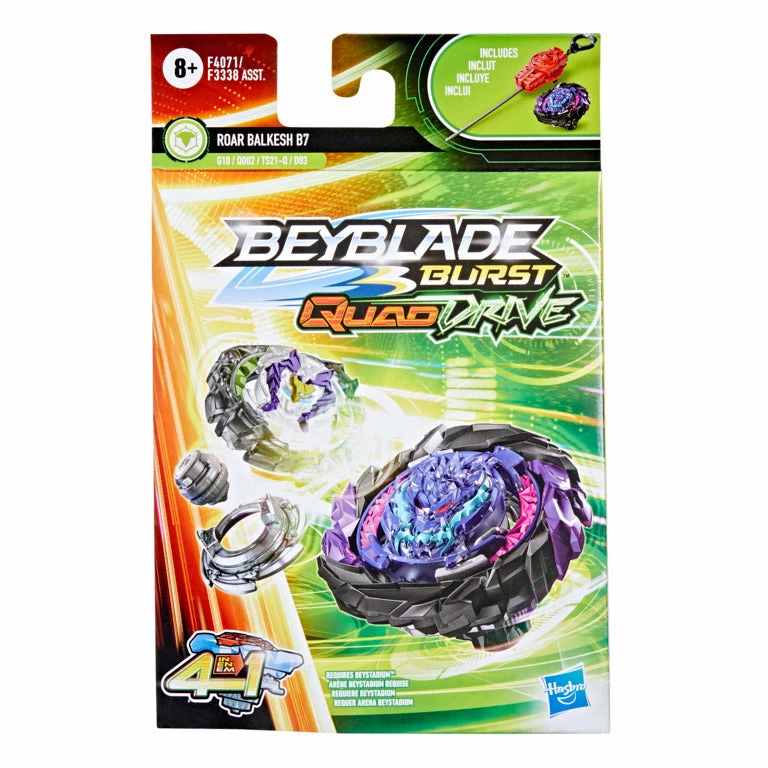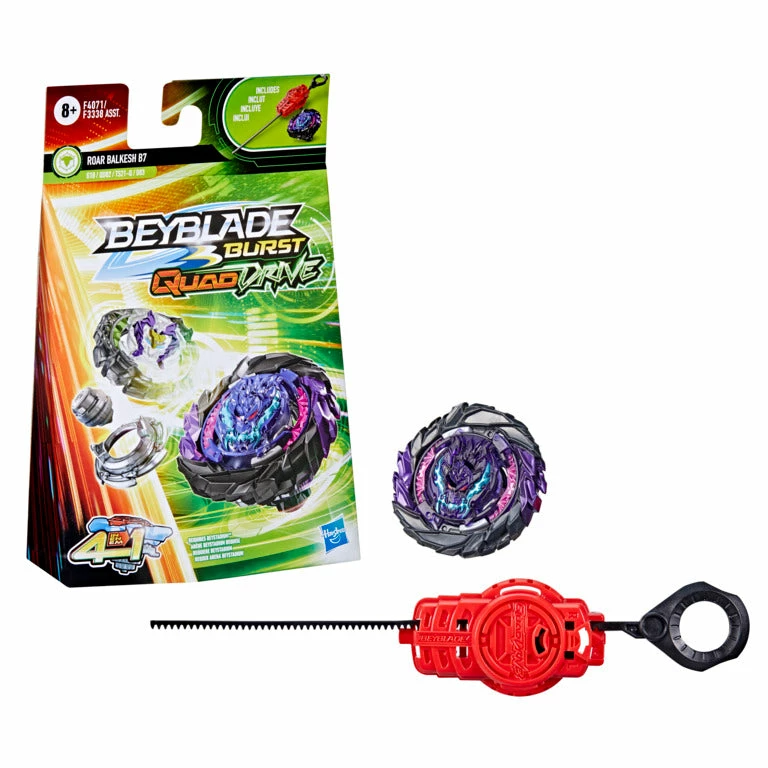 Beyblade QuadDrive tech puts the future of Beyblade battling in your hands with the first ever 4-in-1 Beyblade top! Each QuadDrive top can be configured in 4 different ways, giving you 4 ways to strategize, 4 ways to customize, 4 modes to battle, and 4 modes to win! Size up your opponent and modify your QuadDrive top to gain the ultimate battle advantage. Train to become champion of the arena with the included left-spin Beyblade Burst QuadDrive Roar Balkesh B7 G10 QD02 TS21-Q D03 top and launcher.