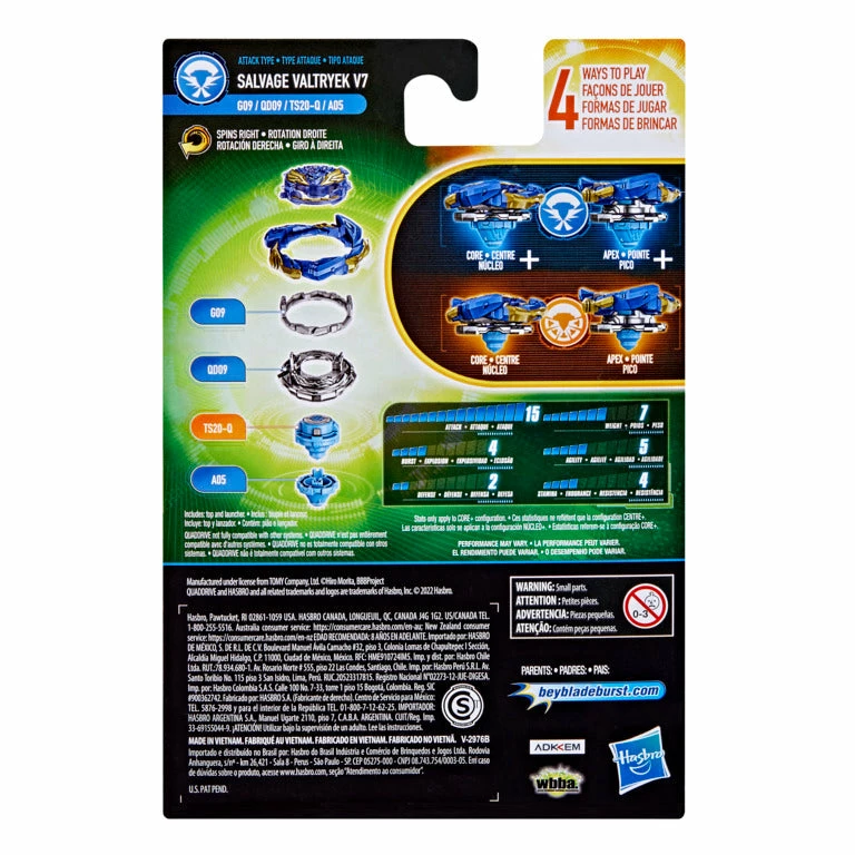 Beyblade QuadDrive tech puts the future of Beyblade battling in your hands with the first ever 4-in-1 Beyblade top! Each QuadDrive top can be configured in 4 different ways, giving you 4 ways to strategize, 4 ways to customize, 4 modes to battle, and 4 modes to win! Size up your opponent and modify your QuadDrive top to gain the ultimate battle advantage. Train to become champion of the arena with the included right-spin Beyblade Burst QuadDrive Salvage Valtryek V7 G09 QD09 TS20-Q A05 top and launcher.