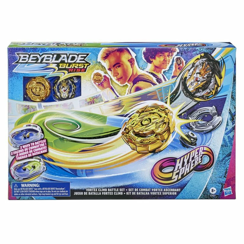 Drop in to victory with Beyblade Burst Rise Hypersphere tech! Hypersphere Vortex Climb customizable Beystadium consists of 4 sections specially designed for exciting Beyblade Burst battles. Climb up the ramp to speed up your attack in the Battle Axis, then drop in from the top level for head-to-head collisions. Get the drop on your opponents for exciting, high-intensity battles!