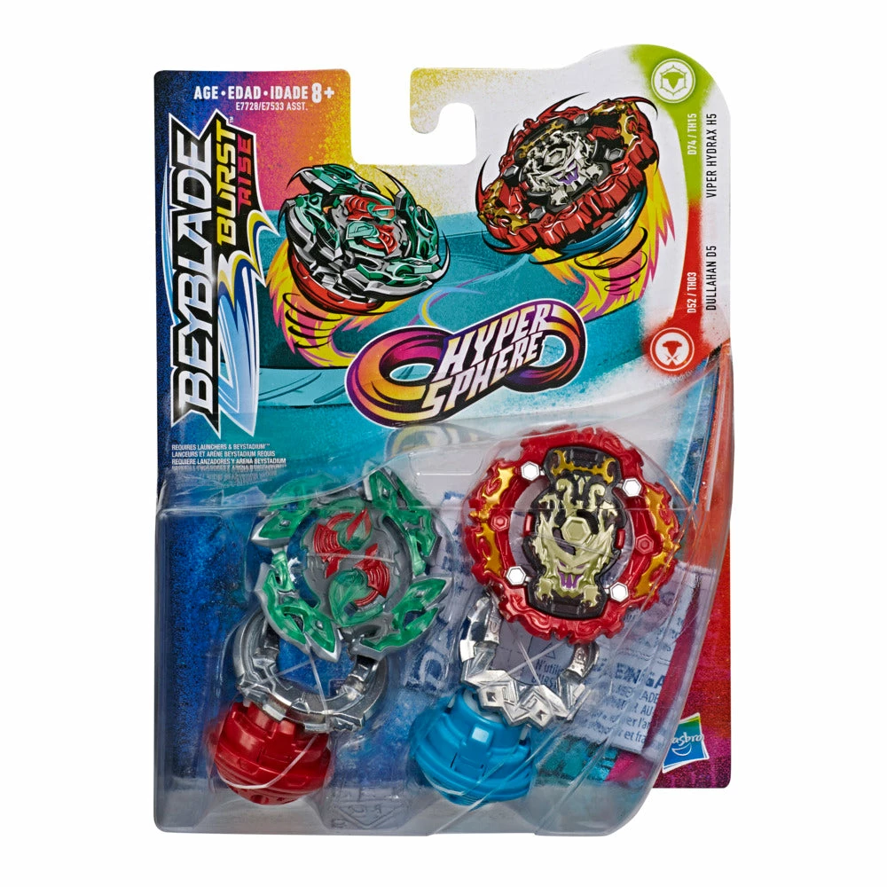 2 BEYBLADE BURST COMPETITIVE BATTLING TOPS: Includes Beyblade Burst Rise left-spin Viper Hydrax H5 D74 TH15 defense type top and right-spin Dullahan D5 D52 TH03 balance type top