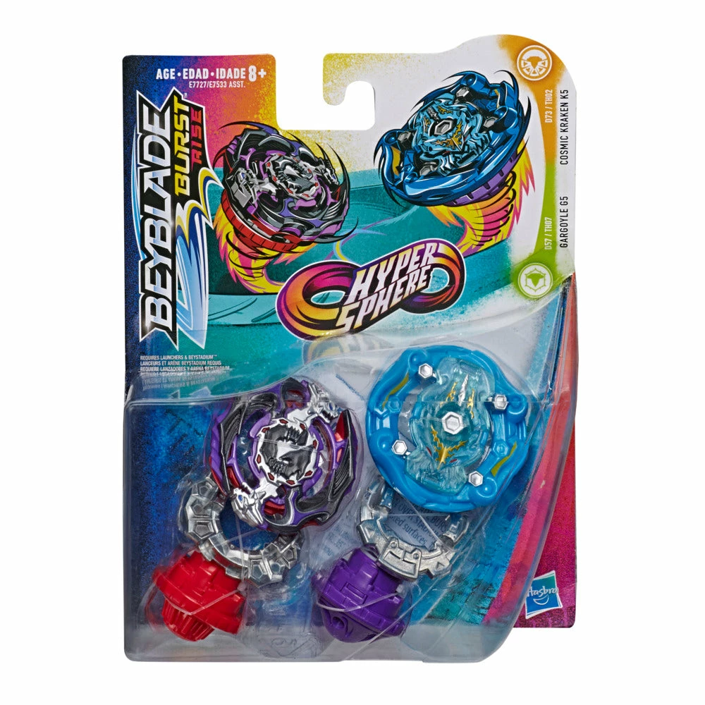 2 BEYBLADE BURST COMPETITIVE BATTLING TOPS: Includes right-spin Beyblade Burst Rise Cosmic Kraken K5 D73 TH02 stamina type top and Gargoyle G5 D57 TH07 defense type top