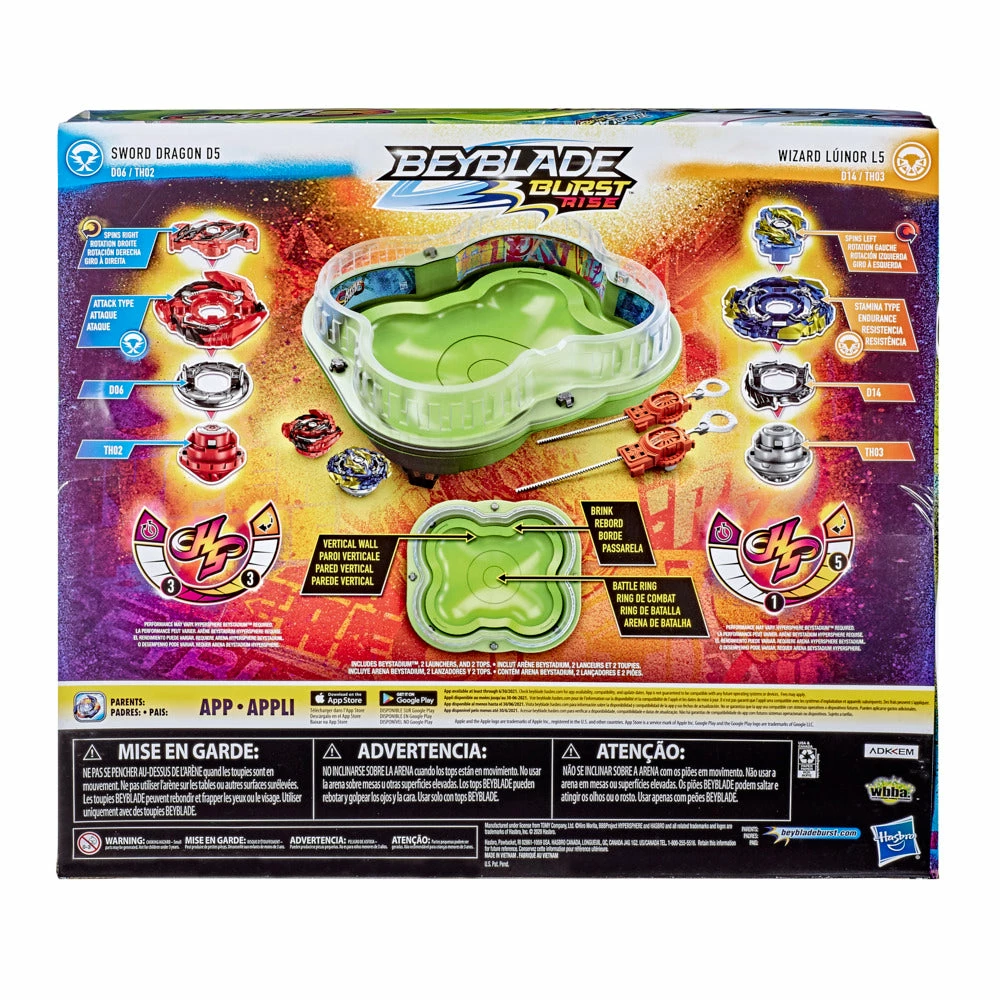 EVERYTHING NEEDED TO BATTLE: This battle set includes Hypersphere Infinity Brink Beystadium, 2 launchers, and battling tops Sword Dragon D5 (attack type) and Wizard Luinor L5 (stamina type)