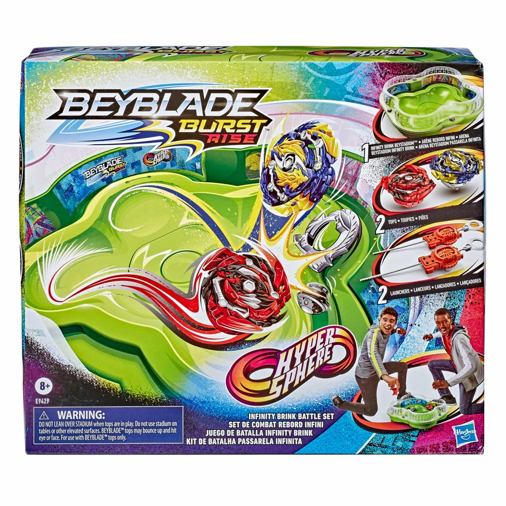 Includes everything needed to battle: Beyblade Burst Hypersphere Infinity Brink Beystadium, 2 right/left-spin Beyblade Burst launchers and 2 Hypersphere battling tops consisting of: