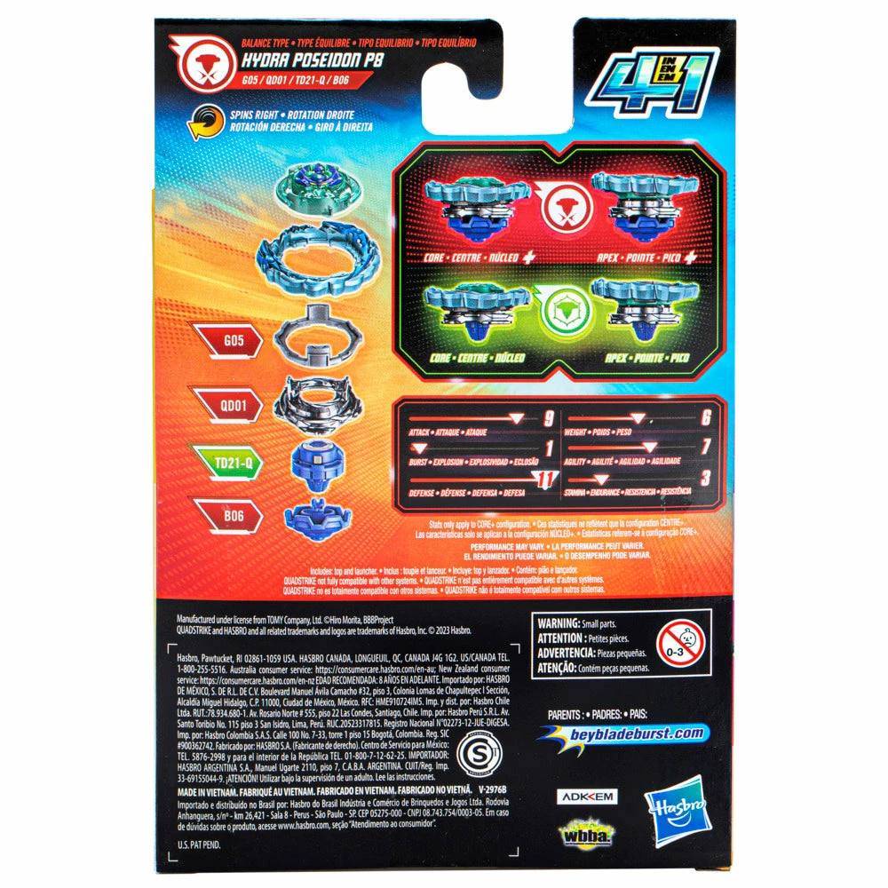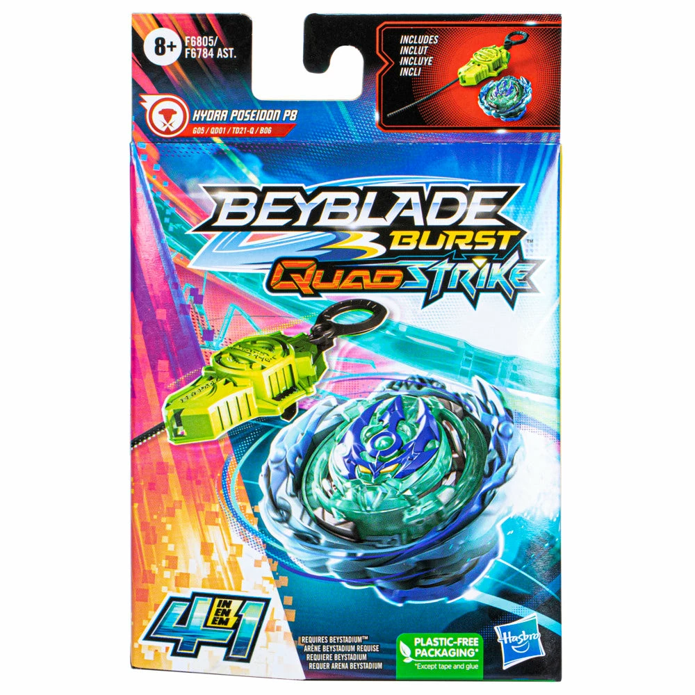 Beyblade Burst QuadStrike Hydra Poseidon P8 Starter Pack launches you to the next stage of Beyblade battling with spinning top toys for 8-year-old boys and girls. QuadStrike tops are enhanced with upgraded Armor Tips designed to intensify battle performance, unleash fiercer strikes, and take down opponents with more intense clashes.