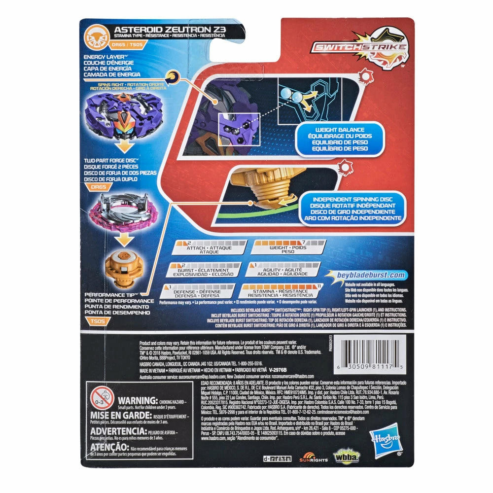BEYBLADE BURST COMPETITIVE BATTLING TOP: Includes right-spin Beyblade Burst Turbo Asteroid Zeutron Z3 DR65 TS05 stamina type top and SwitchStrike left/right-spin launcher.