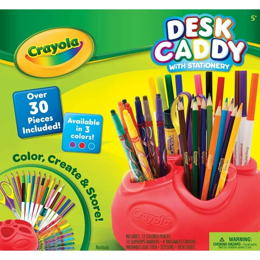 Kids can organise and store crayons, markers, pencils and more with their own colored Crayola Caddy. Help your child to learn to organise supplies the fun way! Includes: 10 SuperTips Washable Markers, 12 Colored Pencils, 8 Twistables Crayons, Washable Glue Stick, Scissors, and Caddy. Caddy available in purple, red or blue.