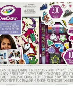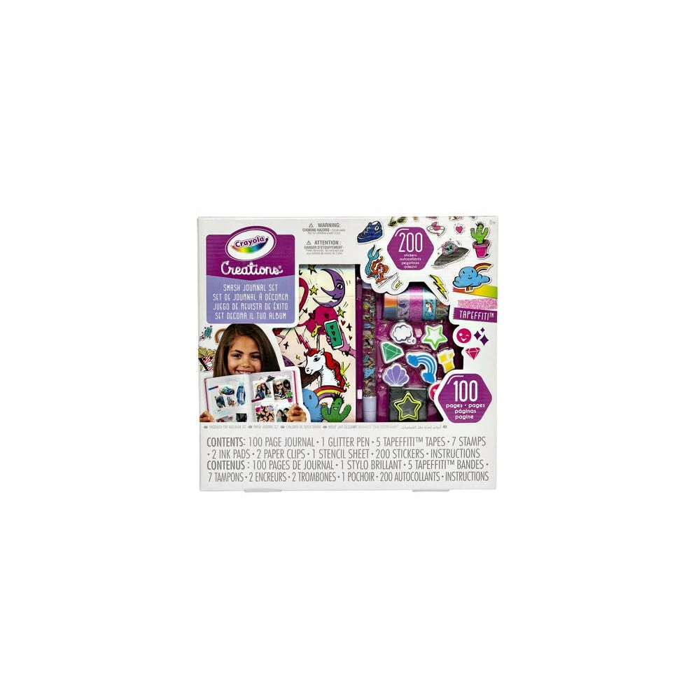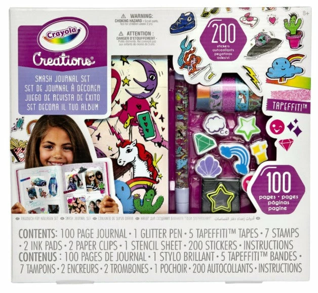 Decorate a 100 page journal with the Smash Journal Kit by Fashion Angels. Use decorative tapes, stamps, & stickers, pictures, & magazine clippings to add your own personal touch to your journal. Features: Let your child embark on an artsy adventure with Crayola Smash Journal Kit All of the items fit perfectly inside a storage case your child can carry anywhere. A great holiday activity! The crayola creations Smash Journal Kit Includes: 100 Page Journal 1 Glitter Pen 5 Tapefetti Tapes 7 Stamps 2 Ink Pads 2 Paper Clips 1 Stencil Sheet 200 Stickers Instructions Suitable for ages 8 & up