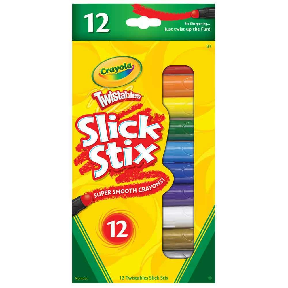 12 ct. Crayola Twistables Slick Stix Crayons – Twist up the fun! Crayola Super Smooth Twistables require no peeling or sharpening. When the tips get worn down, just twist them up and you’re ready to keep on coloring.