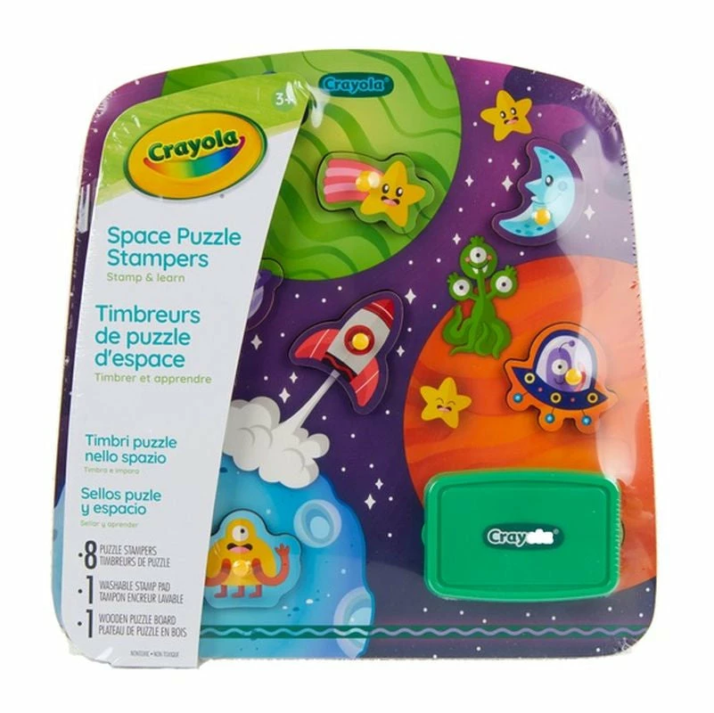 Travel to a galaxy where wooden puzzles reach new dimensions of play, with the Crayola Space Puzzle Stampers! At its surface this handcrafted wooden puzzle is a durable, adorable puzzle for toddlers, but flip each puzzle piece over to find a matching stamp. Using the included Crayola Washable Stamp Pad, toddlers will create their own space themed artwork with aliens, spaceships, planets, and more. This toddler puzzle is ideal for ages 3 & up, and would make a great gift for toddler boys and girls.