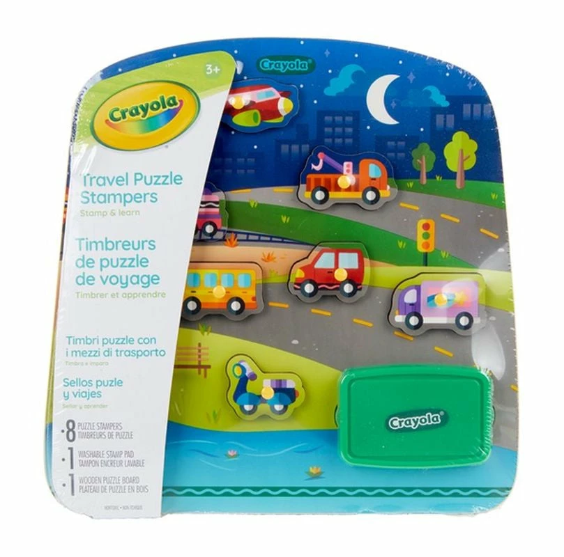 Hit the road with Crayola Travel Puzzle Stampers, an adorable wooden toy for toddlers! Kids love the fun of a classic wooden puzzle, and now there’s a special twist with the added entertainment of stamps in fun travel-themed shapes. This set makes a great gift for toddler girls and boys, throughout the year! Using the Washable Crayola Stamp Pad they will create their own travel scenes with stamps they can then colour in (crayons sold separately). Each wood stamp is handcrafted from durable wood, and fits nicely into the travel puzzle tray. This toddler puzzle is ideal for ages 3 & up