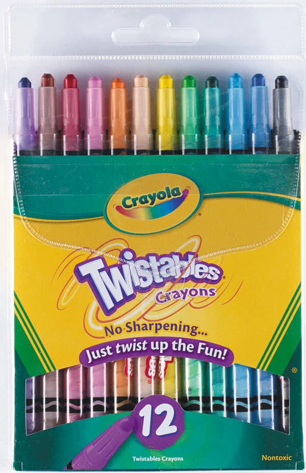 Crayola 12 Pack Twistables Crayons – Twist up the fun! Crayola Twistables require no peeling or sharpening. When the tips get worn down, just twist them up and you’re ready to keep on colouring. The clear plastic barrels keep them from breaking and make it easy to see how much colour is left. Non-toxic.