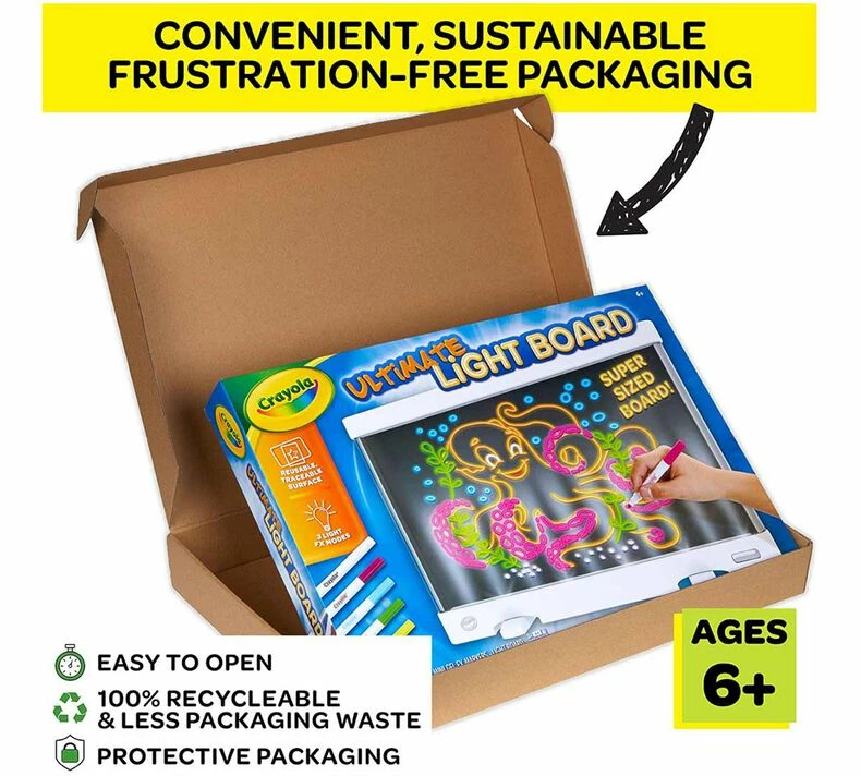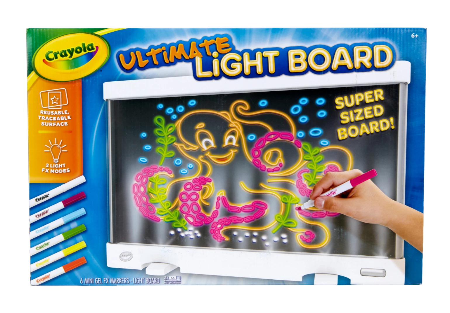 Put your art in lights! With the Crayola Ultimate Light Board you can create amazing art and display it in a big, bold way. Just draw your masterpiece directly on to the Light Board surface and turn it on. Watch your designs shine! The bright LEDs built into the frame make the inks from the included Gel FX Markers really glow! The removable back panel makes tracing images a snap. And when you’re ready, just wipe the screen clean for unlimited creativity.