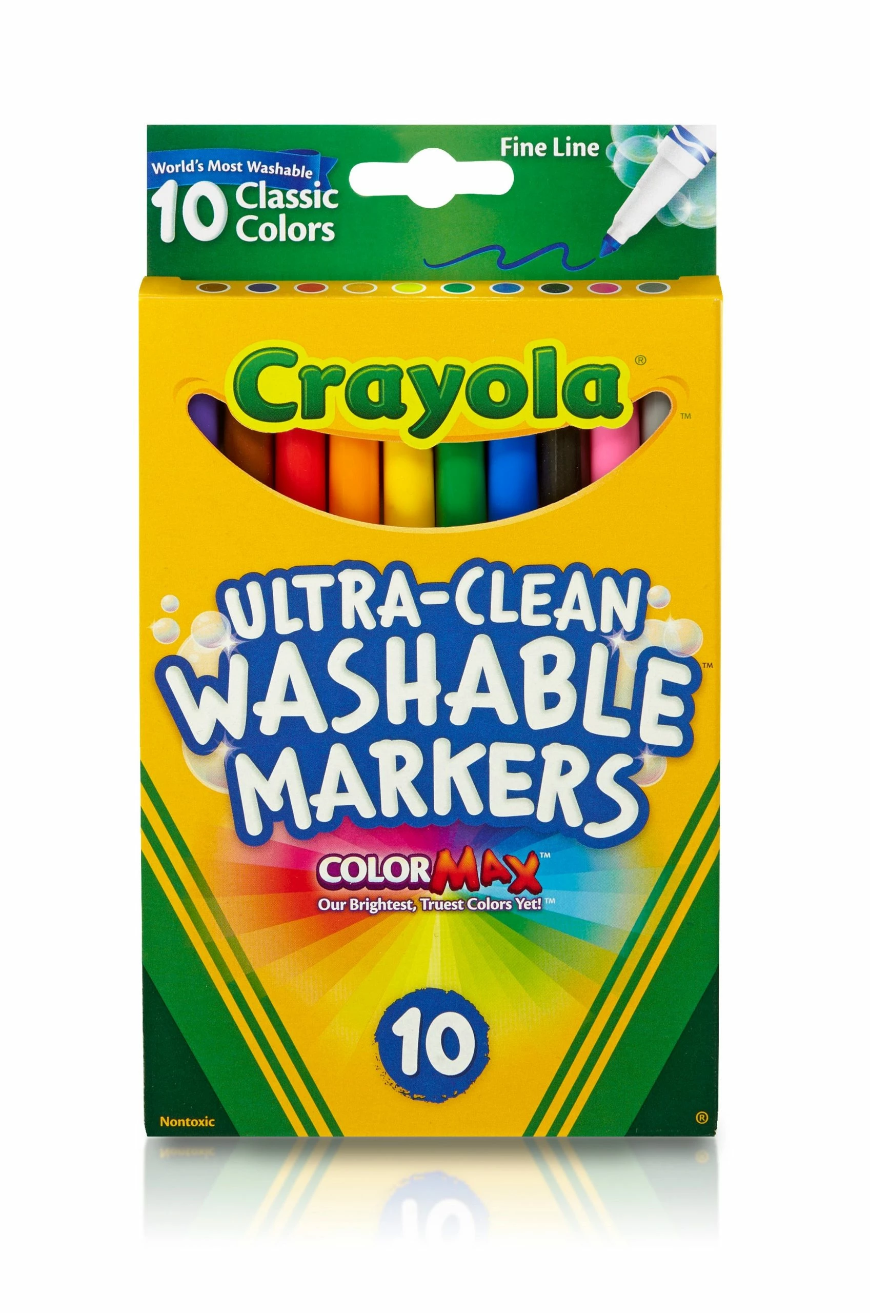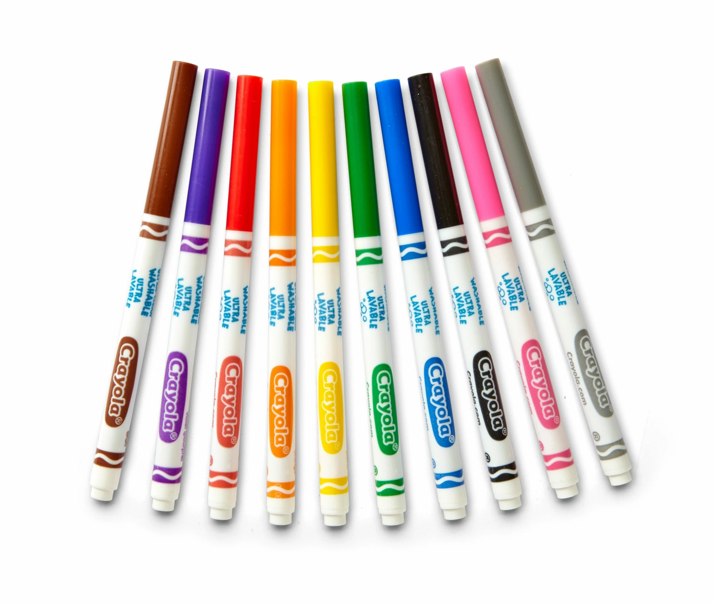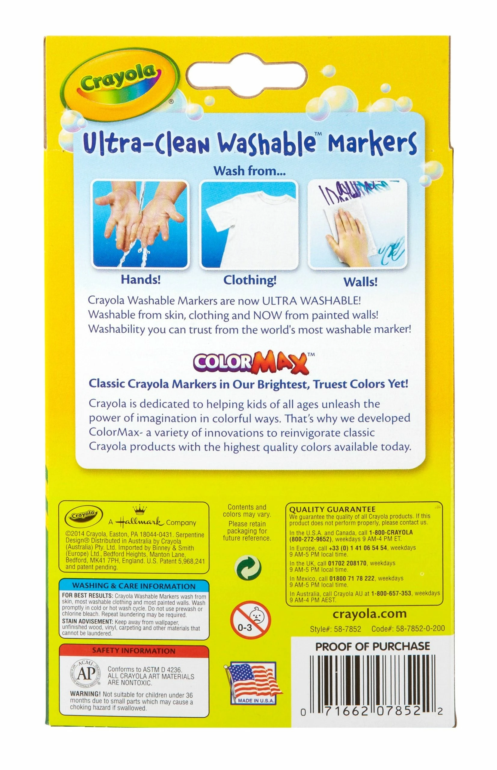Ultra- Clean Washable Markers are specially formulated with ColorMax technology to have the brightest, vivid colors and overall great quality you expect from Crayola. .The Markers feature a versatile tip that allows you to draw thick or thin lines. When compared with other markers, Crayola are longer lasting and won’t dry out as the tip can be rejuvenated by dipping in room temperature water. Crayola’s Ultra-Clean washable ink is specially formulated to wash off machine washable clothing, walls, carpet and furniture.