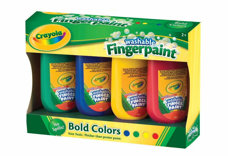Crayola 4 Pack Washable Finger-paint. 4 Bold colours (Yellow, Red, Green, & Blue). Easy to squeeze bottles, thick gel-like feel, easy to spread, and blend together to create secondary colours. Suitable for ages 2 years and up.