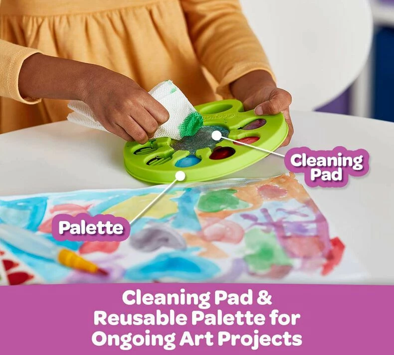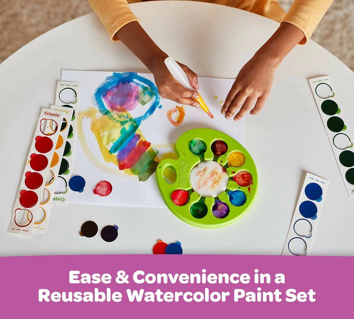 This set includes 16 watercolor chip strips for a total of 96 disposable paint chips in eight different colors, a refillable water brush, cleaning sponge and reusable paint palette. AP certified, non-toxic.Â
